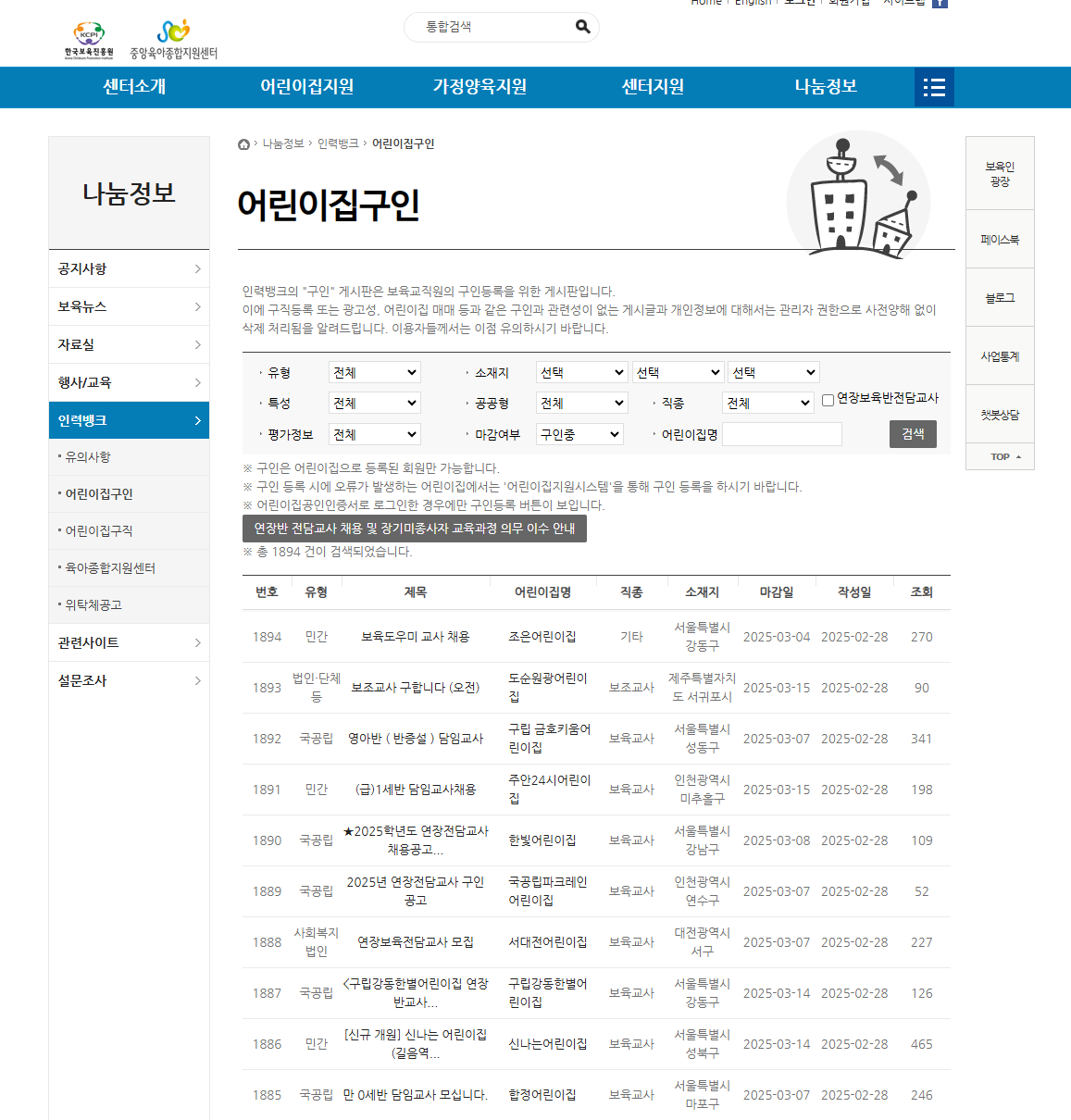 중앙육아종합지원센터 > 나눔정보 > 인력뱅크 > 어린이집구인 (목록)