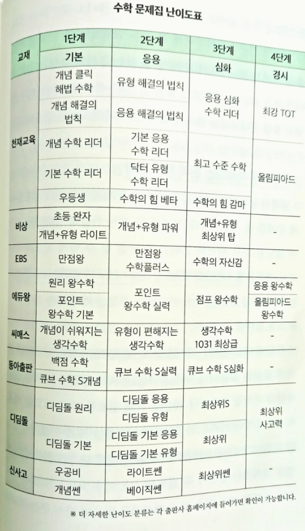 다음은 상위1% 네이버 카페 출처 초등 수학문제집 난이도 표입니다.