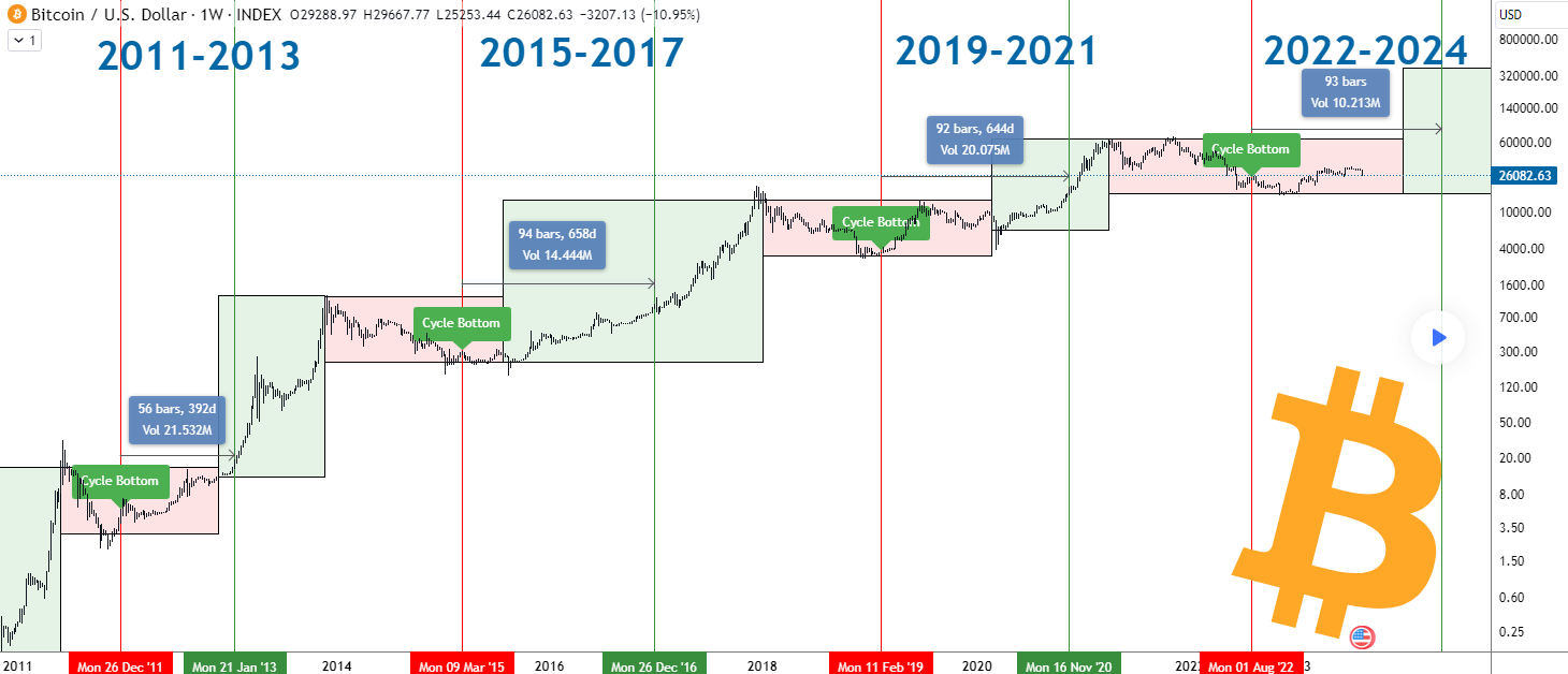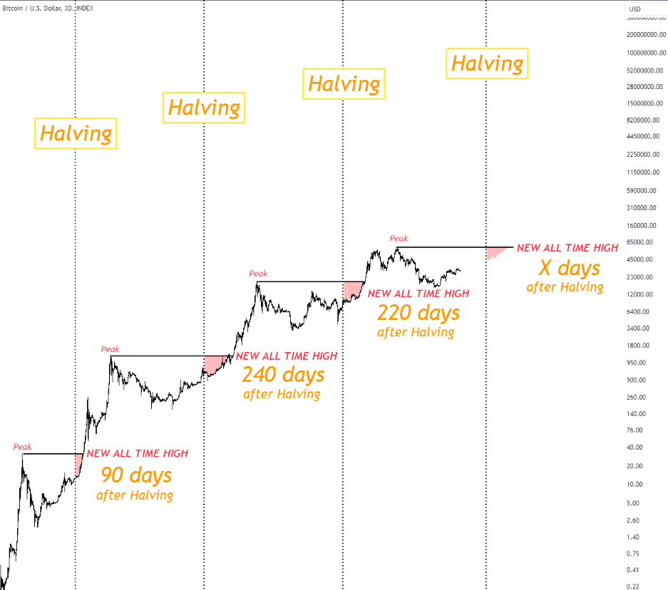 아래 그래프는 반감기를 기점으로 반복되는 비트코인의 가격 변동 사이클의 반복을 보여줍니다.